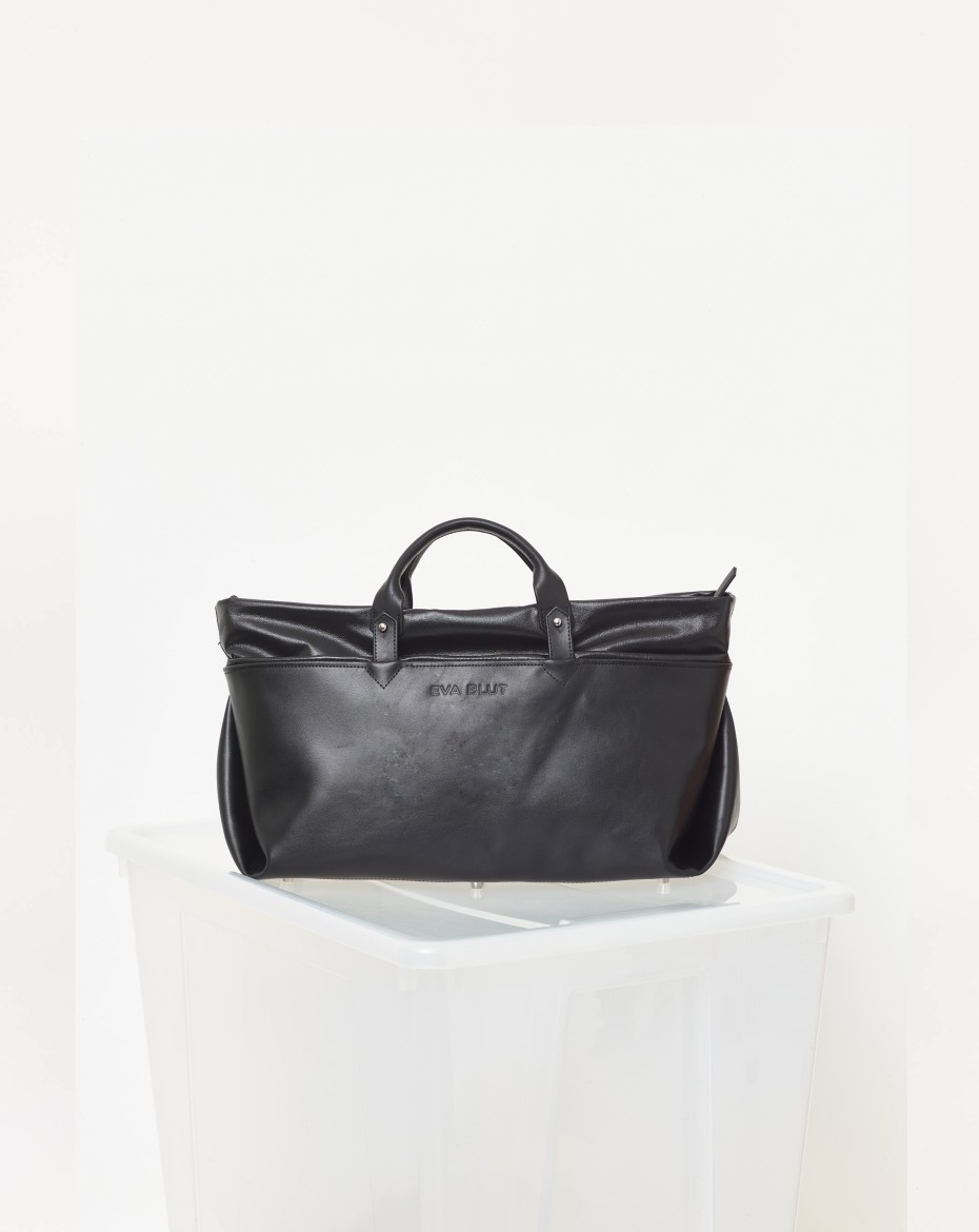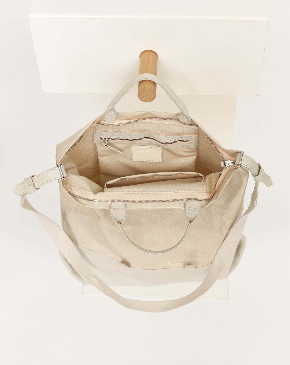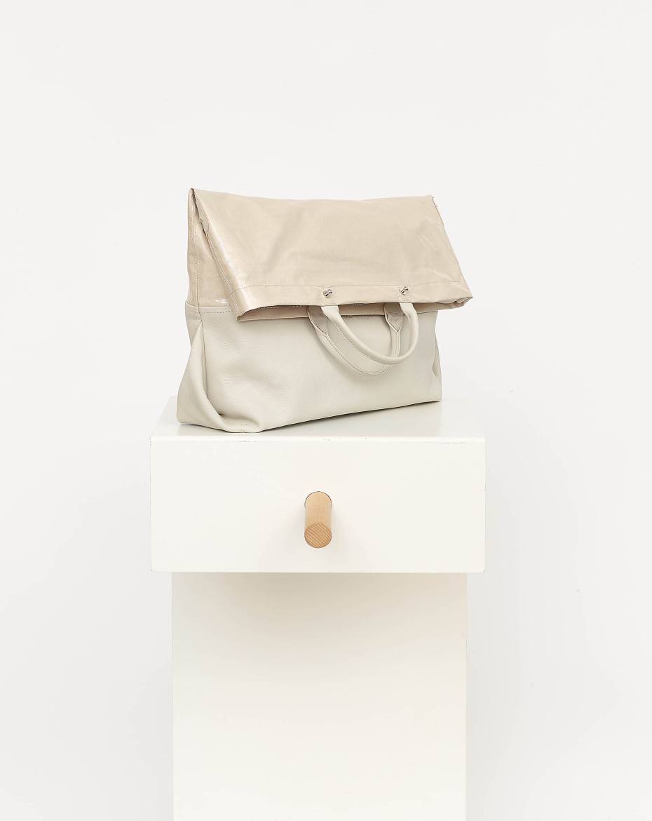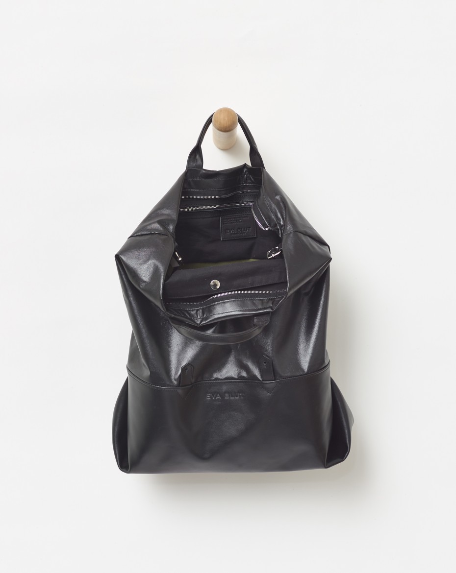 A new generation of an extendable basic format: The height of the canvas can be folded down to form a horizontal outer compartment that runs all the way round. This turns a large bag - big enough for laptop - into a very large one that can be customised to suit the needs.