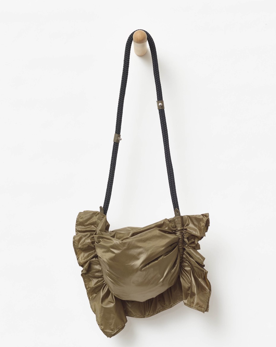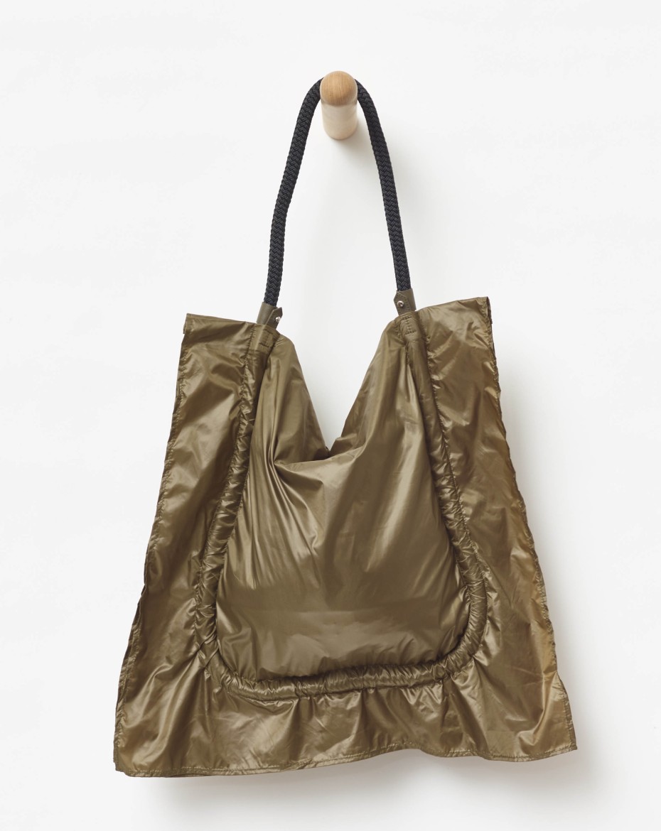 A large, simple pouch bag that can be reduced in size from very large - and flat - to very small - and ruched. The space is formed by the rope-strap that connects the faces.